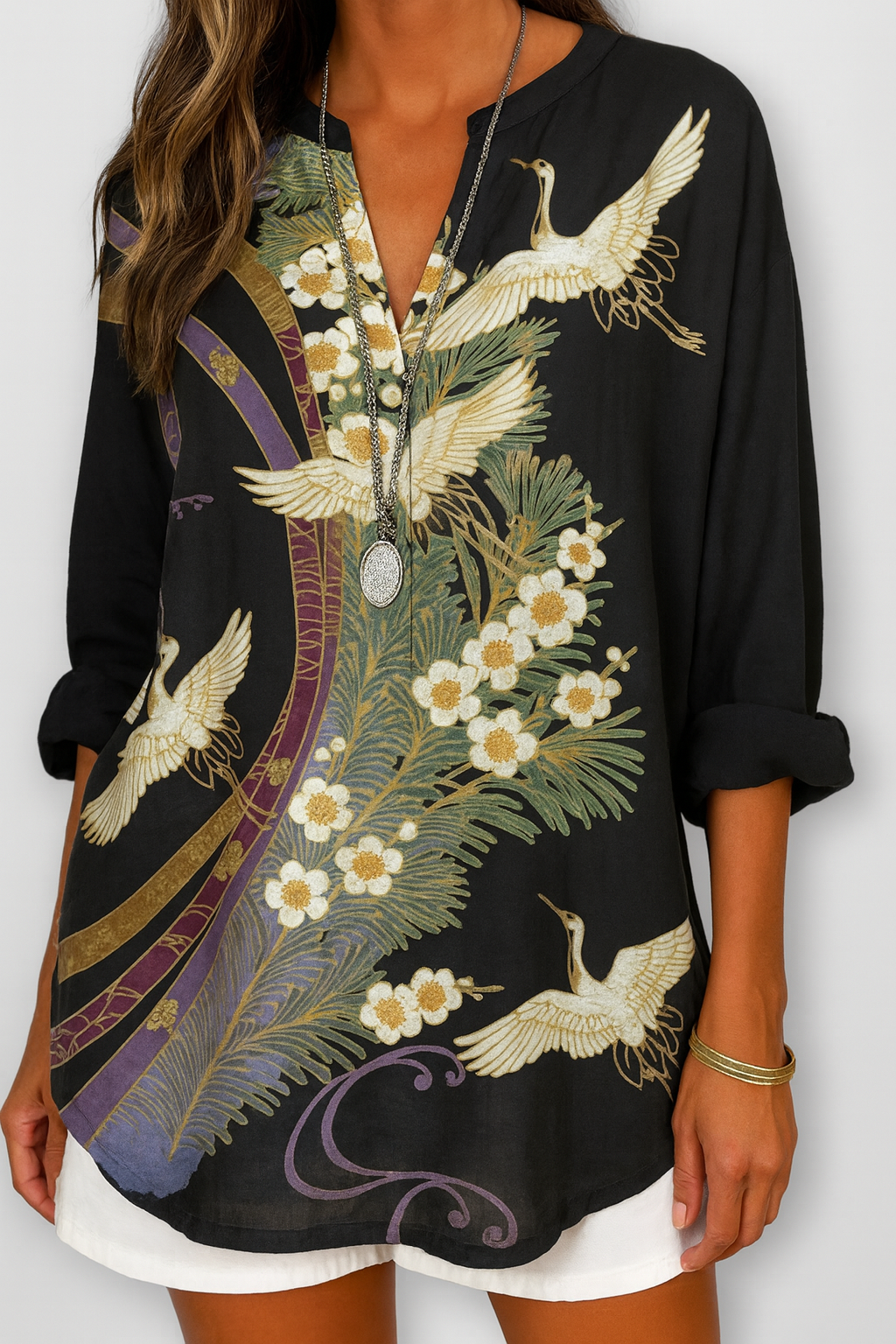 Věra – Halenka s potiskem jeřábů a květin
